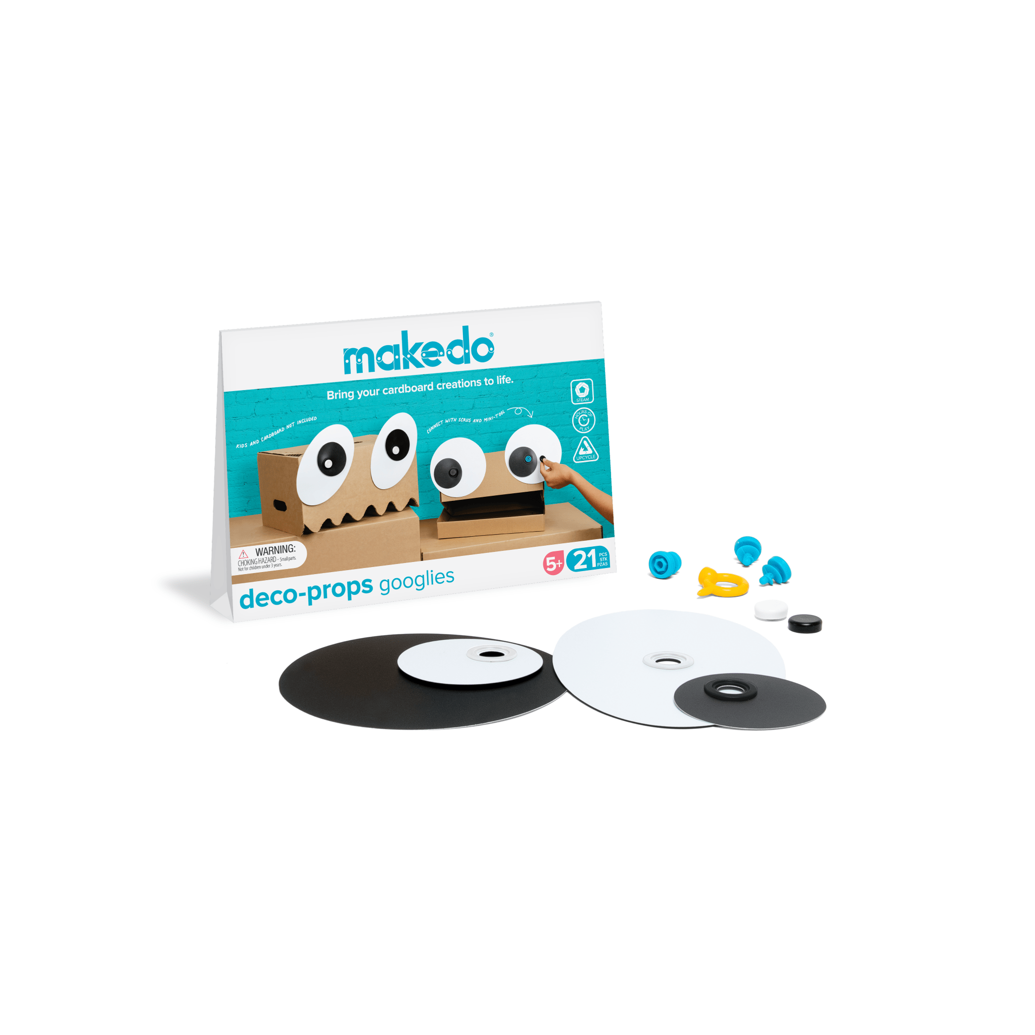 Reversible spheres in black and white, Googlies create expressive eyes on any creation. One of four Deco-Props sets, they are reusable and durable, attach with Makedo Scrus, and layer with other Deco-Props. Includes colour-matched Scru-Dots for a seamless finish.